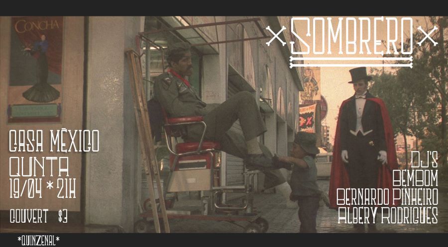 SOMBRERO foi idealizado pelos DJs Bernardo Pinheiro, Mari Jares e Geraldo Nogueira (BemBom), que a cada edição vão convidar um DJ pra animar a noite junto com eles. Sem compromisso nenhum, a Casa México vai estar aberta pra todo mundo entrar, ficar a vontade, tomar um drink, comer um taco e ouvir uma coisa boa.